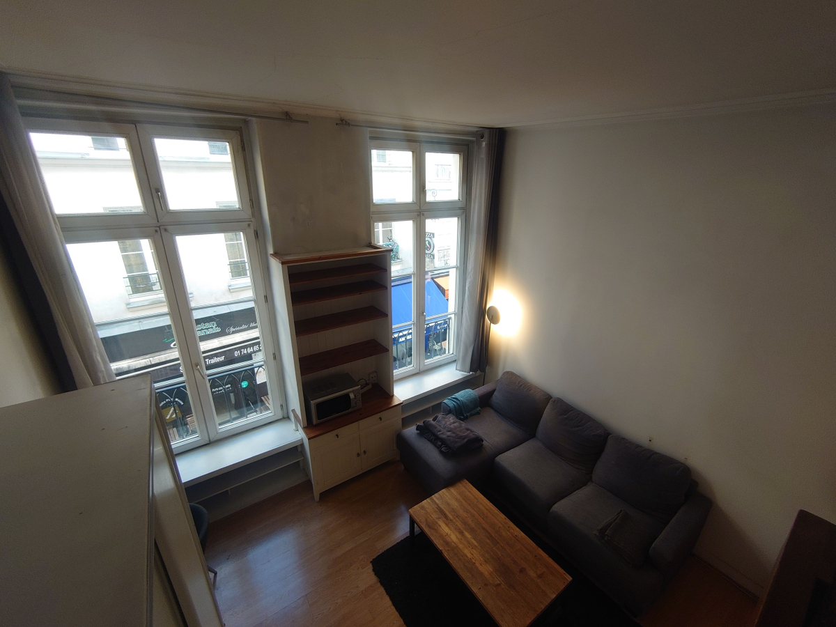 Quartier Latin, au coin de la rue Mouffetard, dans un ancien immeuble, rue Descartes, au 1er étage un studio de 18,42m² habitables comprenant, une pièce à vivre avec une hauteur sous plafond de 4m, un cuisine ouverte équipée (plan de travail, four, plaques, hotte), une mezzanine, double vitrage. Chauffage et eau chaude électriques individuels. Loyer provision pour charges incluses: 1217 euros (1167 + 50). Dépôt de garantie: 2334 euros. Honoraires agence: 276 euros TTC incluant états des lieux d'entrée et de sortie.